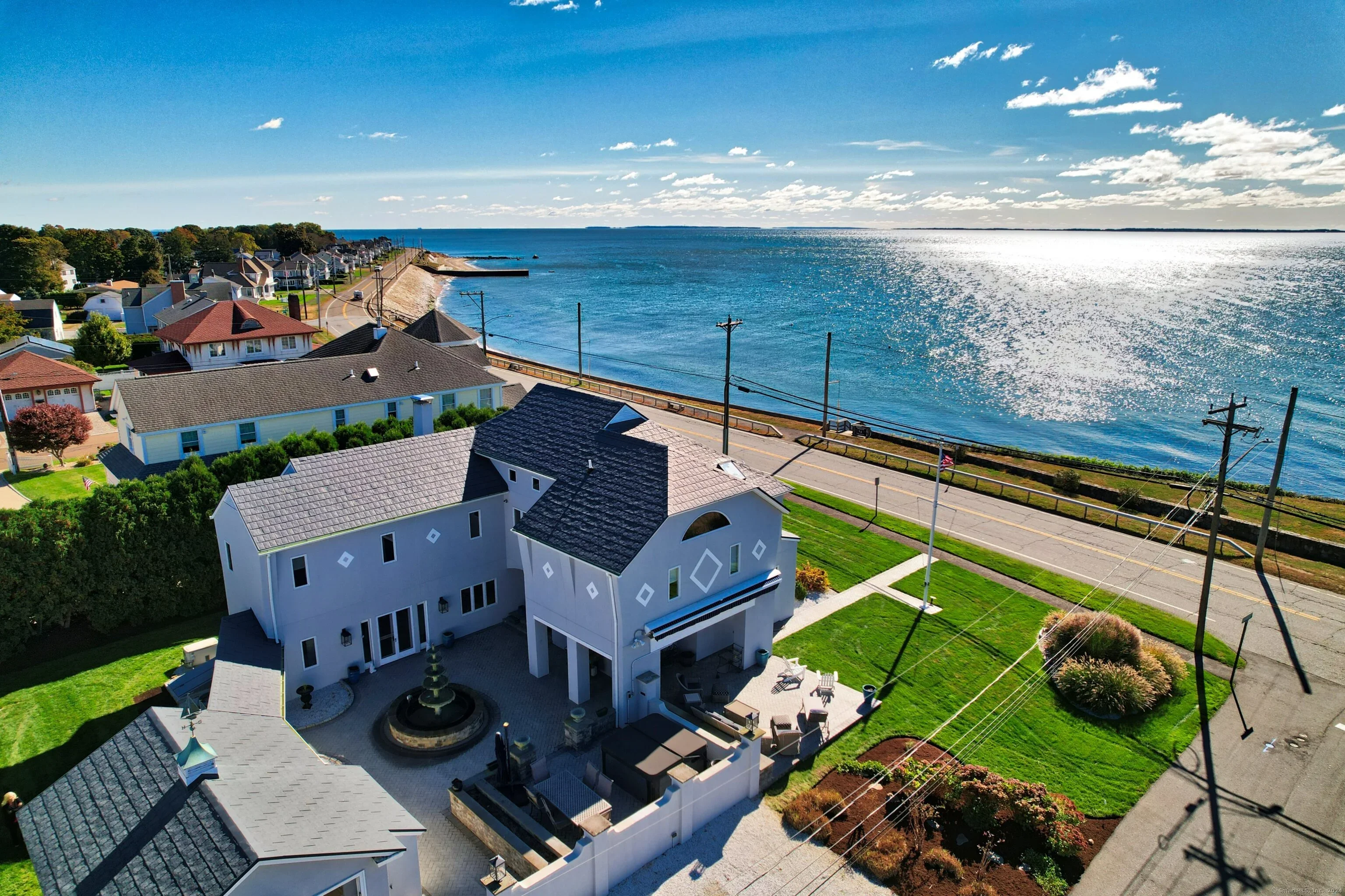 Welcome to your dream home! This stunning colonial with beautiful views of Long Island Sound comes fully furnished with stylish, high-quality pieces, making it the perfect turnkey beach property. The well-equipped kitchen has granite countertops, stainless steel appliances including double Viking Ovens, SubZero fridge, large Island with breakfast bar and access to the patio. The dining room has a built-in service station with granite countertop and is open to the living room. The living room is full of charm with a fireplace and built-in bookshelves. The bright sunroom has wainscoting and shiplap ceiling. The office also has built-in bookshelves and granite countertops. The primary bedroom has an en-suite w/soaking tub, walk-in closet, and access to the balcony. The second and third bedrooms are spacish with shiplap and walk-in closets. The fourth room is equally as beautiful with wainscoting. The finished basement boasts a sauna, cedar closet, an additional family room, and a 5 seat theater with surround sound, projector and wetbar. The outdoor area is an entertainer's dream with an expansive patio, large dining table, hot tub and multiple seating areas to enjoy the water view. This home is part of Knollwood Beach Association which includes access to a private beach and park with tennis/pickleball courts, basketball court, playground. These amenities are a short walk or can be quickly accessed with the included 6-passenger electric golf cart.