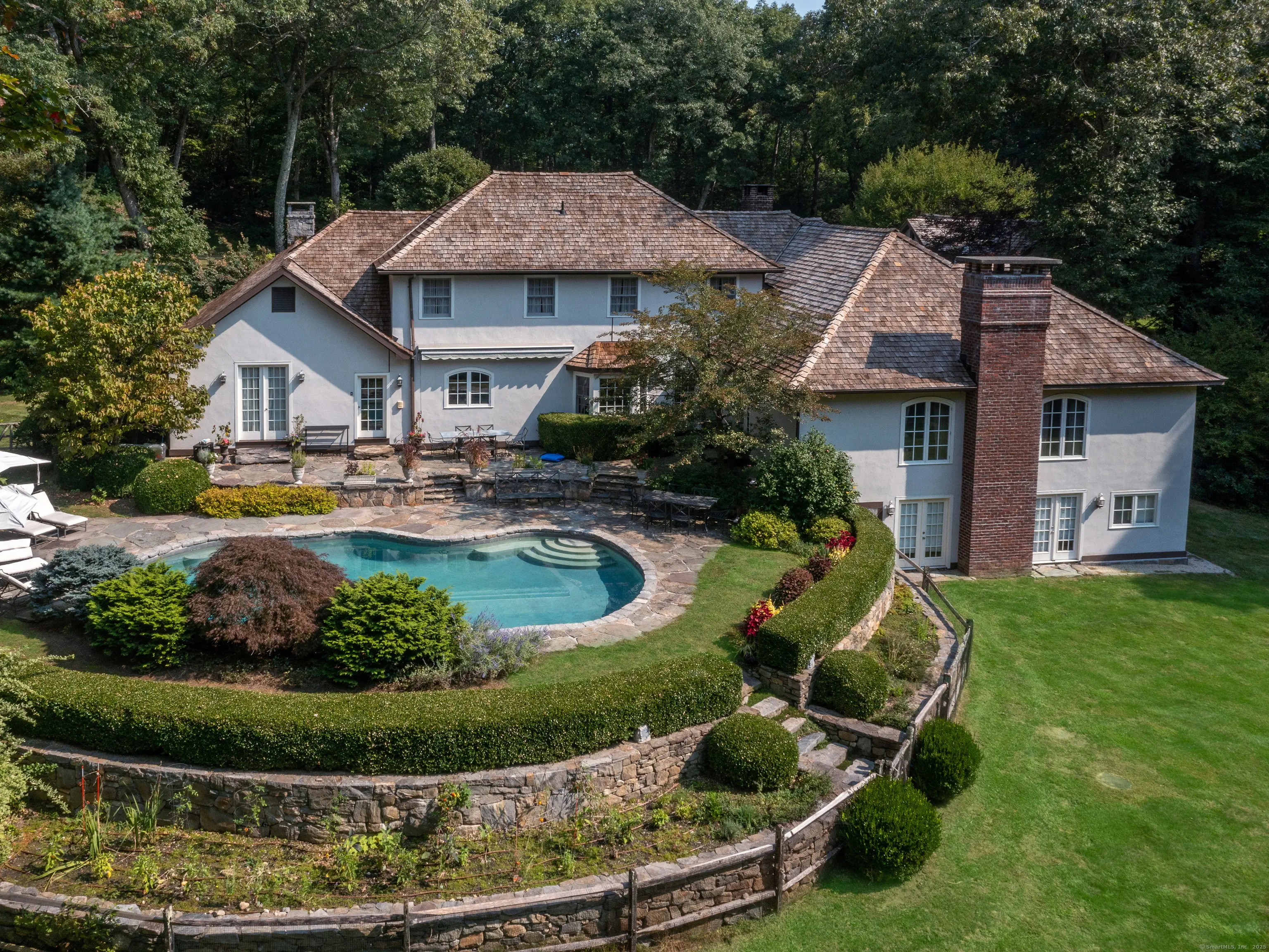 Tranquility awaits down this long paved driveway in Northern Roxbury. Complete privacy with spectacular gardens, pond and orchard surrounded by dramatic rocky outcroppings. This stone and stucco home features large eat-in kitchen, formal dining and living rooms, and a spacious media room. The main floor primary suite includes a fireplace, office space, and large walk in closet. There is an addl guest room on the main level, perfect for nursery or in-laws.3 bedrooms/2 baths on the second level. Lower level game room has full bath and can be used as a 6th bedroom. Gunite heated pool with stone terraces incorporates room for relaxing and dining pool side. 3 car garage has unfinished space above which could be finished to an apartment or studio. Multi zone stereo system. Just 5 minutes to Washington with chic shops, farmer's market and