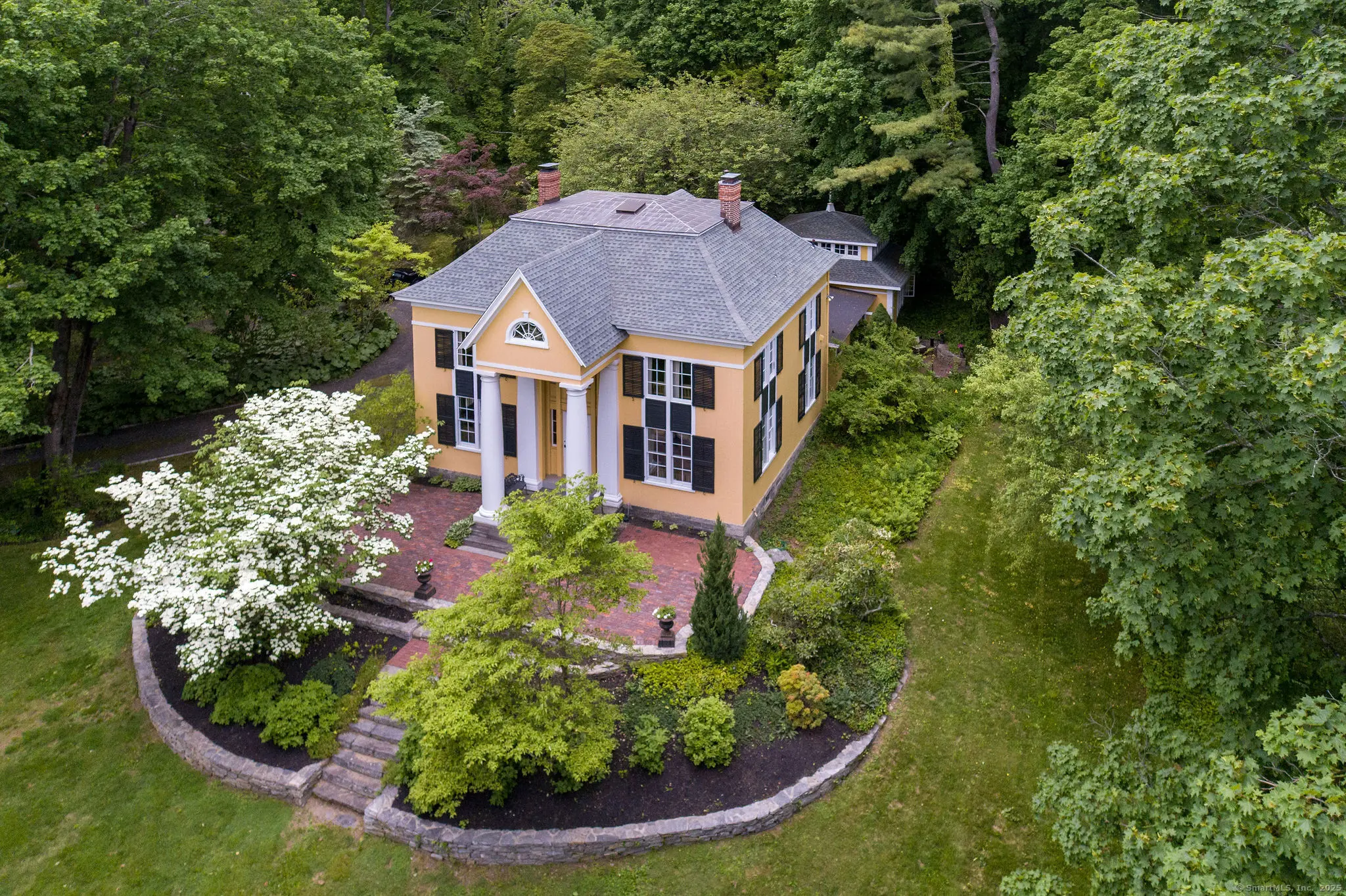 Once known as "Hartsbourne," this storied Madison residence is celebrated for its premier location overlooking the town green and its timeless architectural presence. A true local landmark, the home is distinguished by its striking curved eaved roofline, reminiscent of a pagoda with a unique flat seamed copper roof center. Beautifully aligned with the neighboring Congregational Church, the home shares architectural harmony through its grand columns and elegant two-story shutters. The architect, Mr. Volney Pierce, was commissioned to design this exceptional residence and later the Congregational Church. Inside, the home offers more than 3,900 square feet of living space with soaring 9+ foot ceilings on the main level, 2nd floor with five generously sized bedrooms, five working fireplaces, and the 3rd floor a uniquely large attic with unlimited possibilities. At the back of the property are the outbuildings, a 3 car garage and small coop/shed. "Hartsbourne", has abundant historic character throughout. Set on 1.5+ acres in the heart of Madison's charming village, this is a rare opportunity to own a true piece of local history.