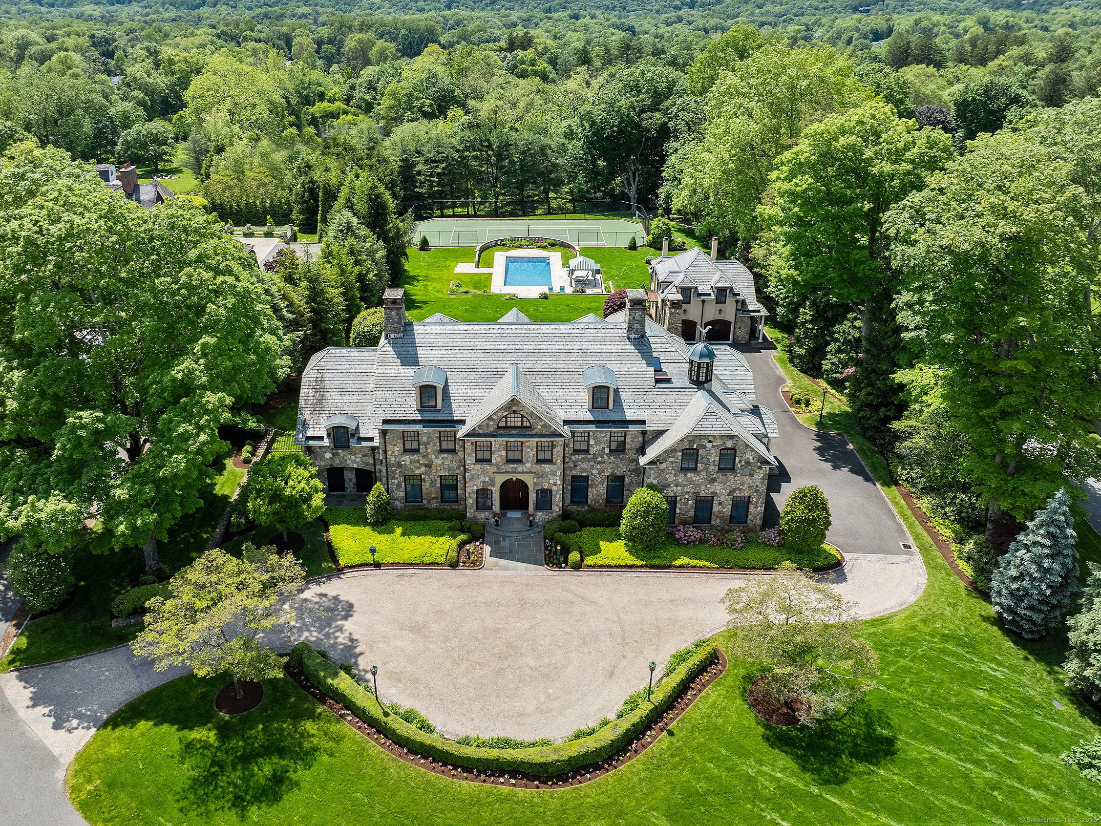 61 High Ridge Ave, a regal estate nestled in the heart of Ridgefield, CT's Historic District, with walking distance to downtown. Custom built in 1997, this exceptional property is anchored by a distinguished Stone Manor-a showcase of timeless elegance, expert craftsmanship, and dedication to quality. Spanning over 8,000 sq ft across 3 levels, the main residence features a stone facade, slate shingle roof, 5 spacious bdrms, and 6.1 baths. A front to back, 2-story foyer filled w/ natural light leads you to an expansive dining room, formal living room and home office/library. Each space is accented w/ rich mahogany windows and doors, hardwood floors and millwork. The large eat-in kitchen flows into the family room w/ fireplace, creating the perfect space to gather. The upper level finds the primary suite w/ 2 walk-in closets, a fireplace and a private balcony. 3 additional ensuite bedrooms and an additional bedroom complete the upstairs. The finished 3rd flr, currently used as a home gym, offers flexibility for a variety of uses. Beyond the main house, is a separate 627 sq-ft studio/cottage complete w/ a full bath and fireplace, ideal for guests, a home office, or artistic pursuits. Main home offers a 2-car garage with height for lifts, complemented by the cottage's additional 2-car garage. Set on 2.61 acres of landscaped, park-like grounds, this remarkable estate also includes a tennis court and serene pool, making it the perfect retreat for both relaxation and entertaining.