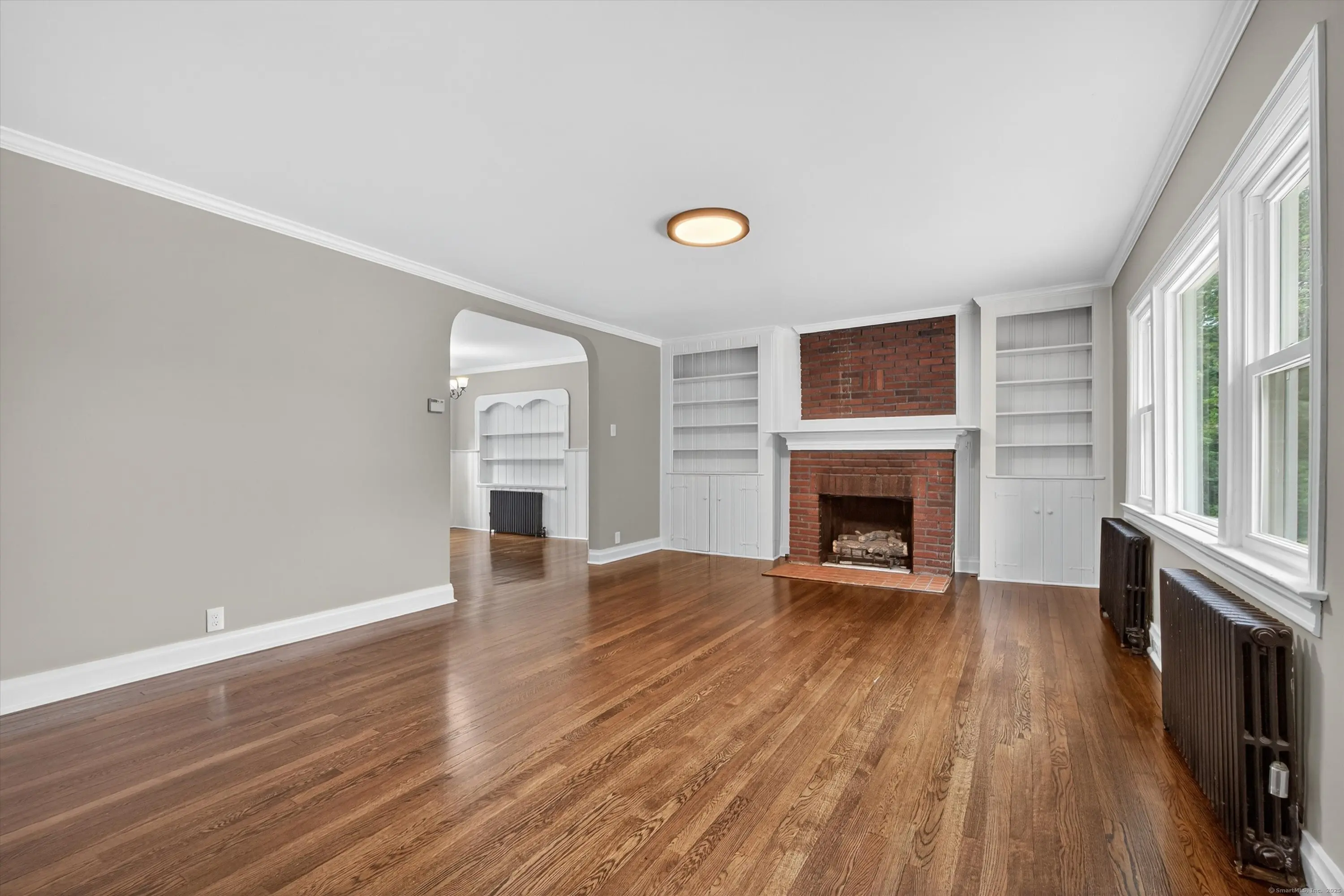 Step into this beautifully updated three-bedroom with den, 2 full bath Cape Cod home. Throughout the home you will find stunning, beautifully refinished hardwood flooring that shine with elegance and fresh professional paint that creates a welcoming and tasteful atmosphere. The expansive 21 x 14 living room is a standout; the cozy gas fireplace takes center stage framed perfectly by custom built-in bookcases-wonderful for cozy evenings or entertaining guests. The elegant dining room boasts a built-in hutch and arched doorway, adding both charm, character and functionality. Located off the dining room, the generous 17.10 x 13.6 family room provides the perfect setting for relaxing or spending time with loved ones. Two generously sized bedrooms are located on the main floor, along with a fully renovated bathroom. Upstairs, you will find an oversized 17.2 x 12.10 primary suite, along with full bath and den. To unwind after a long day, step outside to relax or host with ease on your peaceful patio. Additional highlights include two car garage, full basement for storage, numerous replacement windows, brand new oil tank and other thoughtful updates. Come see it today - A rare home like this won't stay on the for market long! AGENT RELATED