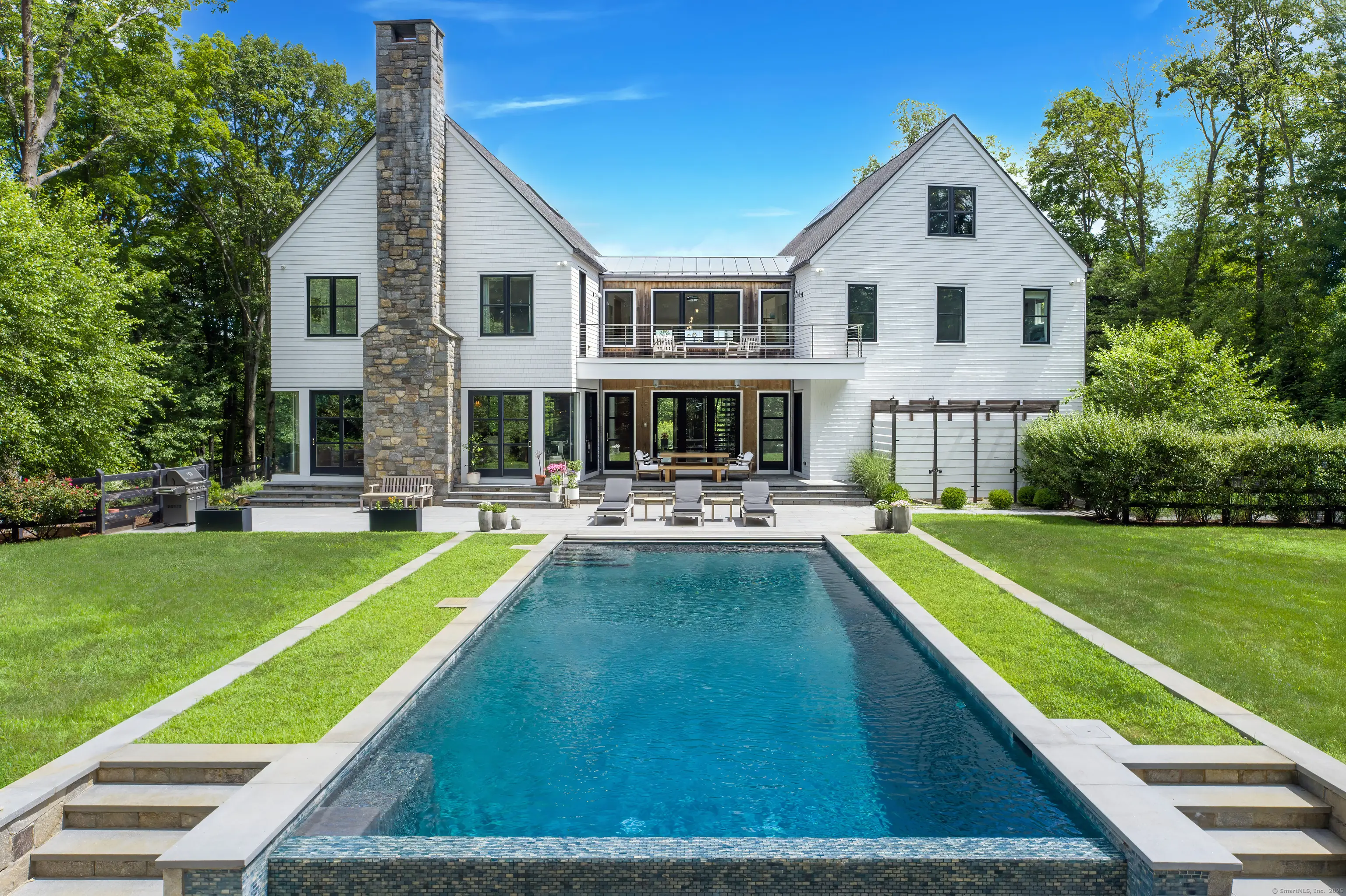 Exceptional custom-built home by top tier builder - Fletcher Custom Homes and designed by acclaimed architect Chris Pagliaro with interiors by Mark Finley. Sophistication and architectural details at every turn. The Main Level impresses with soaring ceilings, radiant heated floors, and walls of glass. An impressive Chef's Kitchen features 2" waterfall island tops and a stunning glass wine wall with cable racks for 500 bottles. Open-concept floor plan invite both entertaining and relaxation and is bathed in natural light. 2nd Level features 4/5 Ensuite BR's include a tranquil Primary Suite w/spa-like bath, spacious walk-in dressing room & balcony overlooking the breathtaking rear yard. A Family Rm, Gaming/Media Rm & Laundry complete this level. Third floor offers a Media/Flex Space + Office with oversized ridge skylights. A walk-out lower level with polished concrete floors includes a full gym area, storage, and potential for Au Pair Suite, indoor Pickle Court, or Bonus Room. Resort-style outdoor living is unmatched with a saltwater infinity-edge pool, auto cover, waterfall, outdoor shower, fire pit & bocce court. Expansive lawns, curated landscape + hardscape unfold across 2+ private acres. Heated 4-car garage for the auto enthusiast. Being sold fully furnished. Coveted SW Redding location with direct access to Devil's Den Preserve and minutes to both Ridgefield and Wilton. Approx. 1 hour to NYC. A true one-of-a-kind lifestyle or weekend retreat. Impossible to Re-Produce!