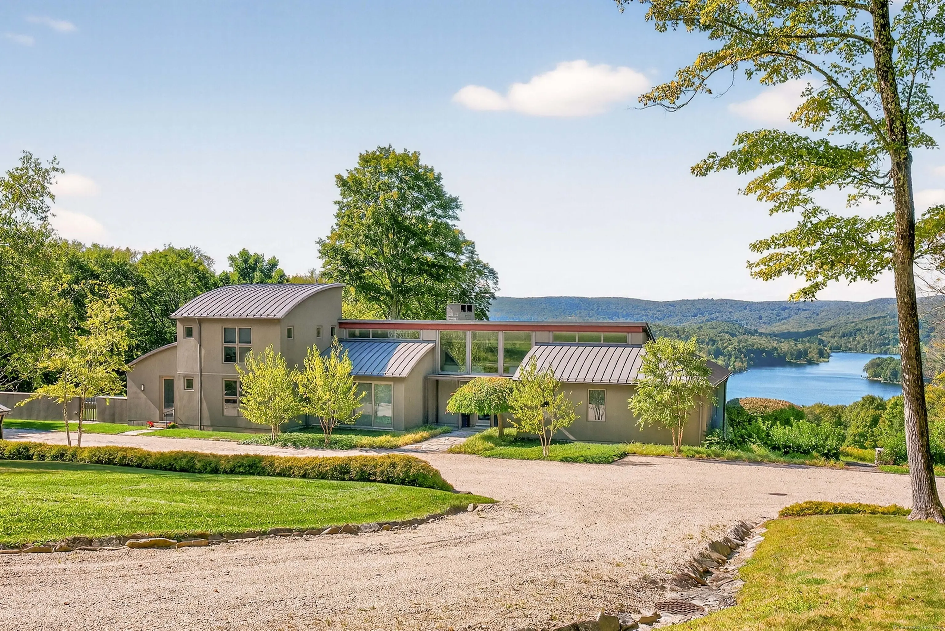 The Crown Jewel of Lake Waramaug, AKA 263 West Shore Rd. Set on 69 acres with direct lakefront, this stylish and sophisticated modern home is one of the largest estates on Lake Waramaug, offering a rare combination of waterfront access, privacy, and uninterrupted views. Unlike most lakefront properties, this estate provides both a move-in-ready modern retreat and exceptional expansion opportunities, featuring a separate West Shore Road address with over 250 feet of shoreline on the lake's quietest stretch. The waterfront includes a beach with large teak dock, dedicated picnic area, and ample guest parking. The 4,125 sqft modern home built in 2002 features concrete, stucco, and expansive glass construction. The interior showcases vaulted ceilings reaching 23 feet, bamboo flooring, and open-plan living spaces with continuous lake vistas through wall-to-wall windows. The gourmet kitchen boasts honed soapstone counters, Sub-Zero refrigeration, Thermador, and Miele appliances, and butler's pantry with pool/patio access. Living room features a wood-burning fireplace and access to screened porch. The private primary suite wing offers lake views, a walk-in closet with built-ins, en-suite bath with dual vanities, glass-enclosed shower, air-jet tub, and 2 private water closets. Adjacent is a separate office/nursery.