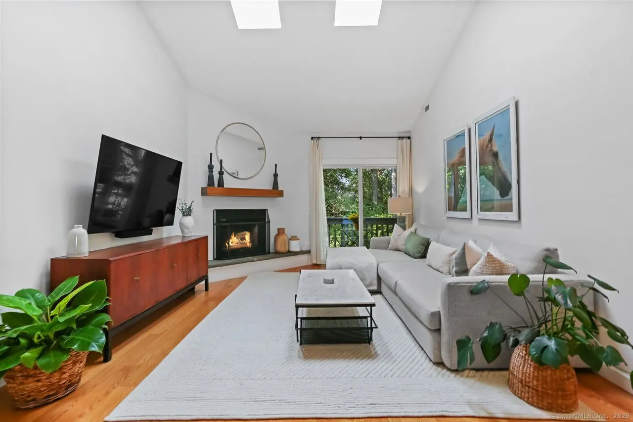 Every detail has been reimagined in this top floor 2BR, 2 full bath condo, offering sleek, fully renovated single level living in a quiet 16-unit community in the charming Wolfpit neighborhood. The spacious skylit living room boasts vaulted ceilings, a wood-burning fireplace, and a slider to a private deck with peaceful wooded views. The open concept dining area flows seamlessly into the remodeled kitchen, featuring custom cabinetry, quartz countertops, and modern appliances. The serene primary suite offers double closets, a ceiling fan, and a beautifully remodeled en-suite bath with glass shower doors. A second generously sized bedroom has a large closet and easy access to the renovated hall bath. Side-by-side laundry is tucked conveniently in a hall closet along with extra storage. Thoughtful upgrades throughout include gleaming hardwood floors, recessed lighting, fresh paint, upgraded attic insulation for added efficiency, newer water heater, and a well-maintained HVAC system serviced twice yearly. Full improvements list in supplements. A detached garage with large storage room, plus ample guest parking, adds convenience and flexibility. Move-in ready, this home offers the comfort of single family living with the ease of a condo, minutes to Westport, shopping, train stations, and major highways.