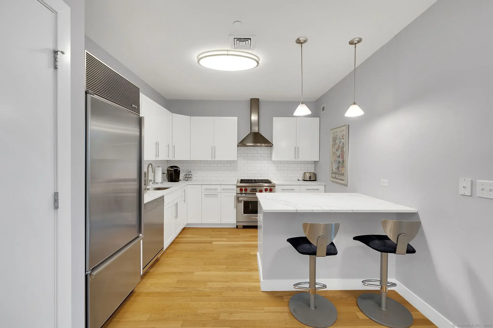 Convenience & sophisticated style is what you get with this ultra-chic 2 bedroom, 2 full bathroom condo located in a private concierge building downtown Stamford. Enjoy the open floor plan, 10-11ft soaring ceilings, and large-pane oversized windows offering gorgeous panoramic sunset views overlooking the city. Hardwood Floors throughout, expansive rooms and the ultimate dream kitchen featuring custom white shaker style cabinets, quartz countertops and Wolf / Sub Zero appliances. Absolutely spectacular primary bedroom with huge walk-in custom closet and spa inspired bathroom with double sink vanity, stall shower, and built-ins. Additional features include parking garage with two reserved spaces, fitness center, temperature controlled wine cellar and lounge/party room perfect for holiday hosting or weekend entertaining.