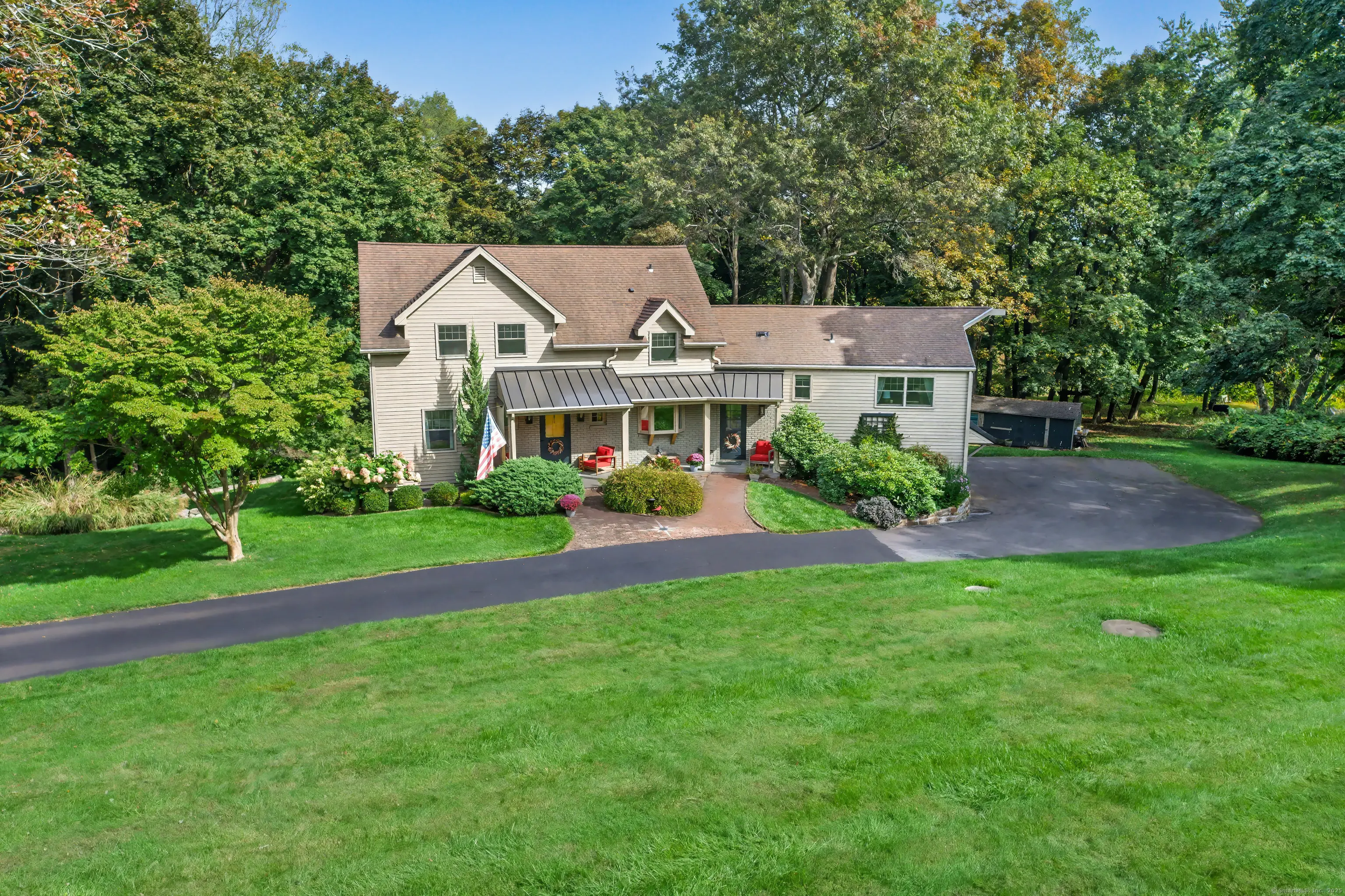 Welcome to 75 Saint Johns Road! Tucked away at the end of a quiet cul-de-sac on Ridgefield's desirable south side, this unique property offers rare privacy with an adjacent open space backdrop. Originally the barn for the historic Hillscroft Farm, the structure was thoughtfully converted to a residence in 1976 with a poured concrete foundation and steel (H&I beam) reinforcement, blending character with long-lasting stability. The main level exudes warmth and sophistication with soaring ceilings, exposed beams, and a wood-burning fireplace creating a cozy gathering space. An expansive walkout deck invites al fresco dining and relaxation. The newly updated kitchen features custom soft-close cabinetry, a hand-hammered copper farmhouse sink, Bertazzoni range, and Liebherr refrigerator-an ideal space for both everyday living and entertaining. Upstairs, the private primary suite offers a dressing room and renovated full bath. Three additional bedrooms and a full hall bath complete this level. The lower level is designed for comfort with a second fireplace, perfect for movie nights, plus an office nook, laundry, and direct access to the two-car garage. Outdoor living is equally inviting with a welcoming front porch, stone patio, and tree-lined surroundings. Don't miss the chance to own this one-of-a-kind Ridgefield home, schedule your showing today!